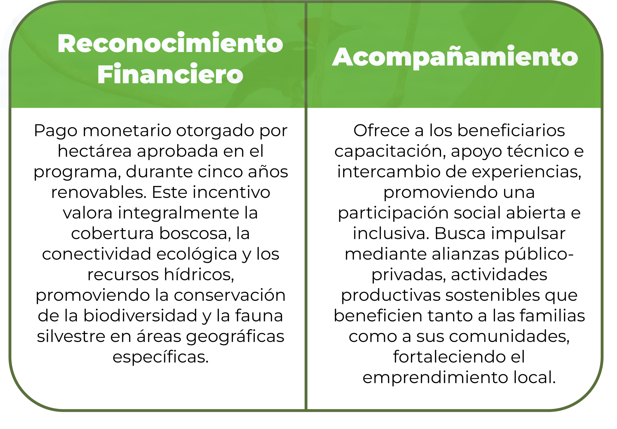 Se basa en dos componentes principales, un reconocimiento financiero y un acompañamiento a los propietarios y poseedores sobre temas específicos de interés.